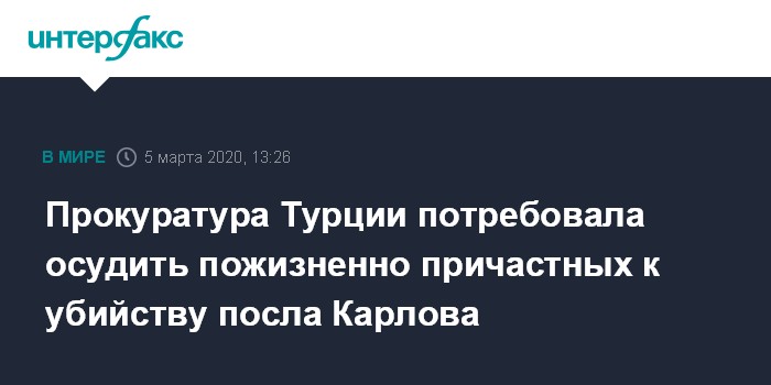 Москва. 5 марта. INTERFAX.RU - Турецкая прокуратура потребовала, чтобы восьмерых обвиняемых в причастности к убийству посла РФ в Турции Андрея Карлова приговорили к пожизненным тюремным срокам, сообщает агентство "Анадолу".