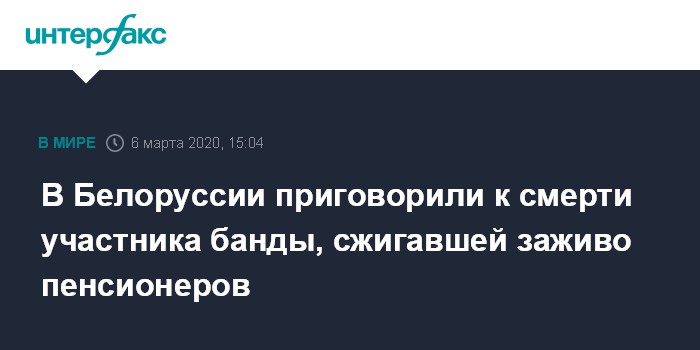 Москва. 6 марта. INTERFAX.RU - В Белоруссии вынесен смертный приговор одному из участников "слуцкой банды", убивавшей пенсионеров, сообщил незарегистрированный в республике правозащитный центр "Весна".