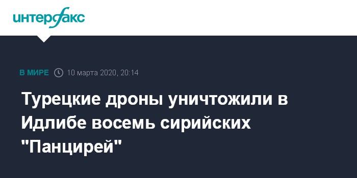 "Конечно, сейчас в Идлибе размещены комплексы "Панцирь". Они есть и в Ливии. В Идлибе мы уничтожили восемь "Панцирей" с помощью наших беспилотников SIHA. Они ("Панцири" - ИФ) очень ценны, это важные системы противовоздушной обороны", - передает слова турецкого лидера во вторник информационное агентство "Анадолу".