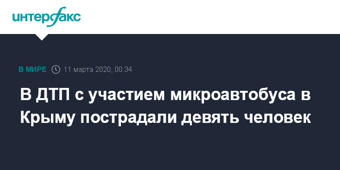 Москва. 11 марта. INTERFAX.RU - Девять человек пострадали в аварии с участием микроавтобуса и легковушки в Крыму во вторник вечером, сообщила пресс-служба ГУ МЧС по республике.