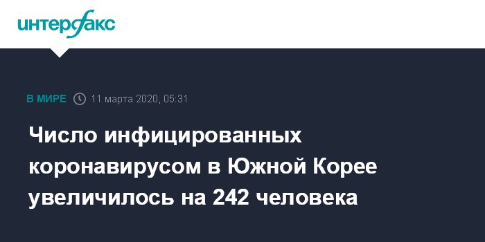 Москва. 11 марта. INTERFAX.RU - По состоянию на утро среды, 11 марта, в Южной Корее число инфицированных коронавирусом Covid-19 достигло 7,775 тыс., за истекшие сутки зарегистрировано 242 новых случая заражения, сообщили медицинские власти РК.