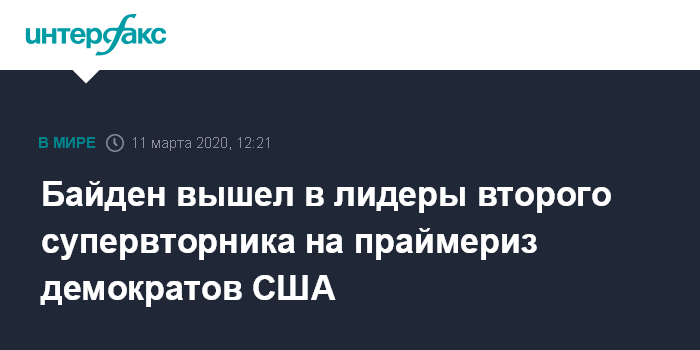 Москва. 11 марта. INTERFAX.RU - Победителем демократических праймериз по итогам очередного супервторника в США становится бывший вице-президент Джо Байден, сообщает американский телеканал CNN со ссылкой на промежуточные данные.