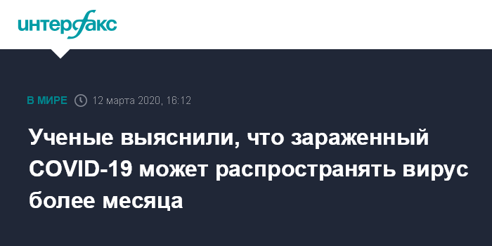 Москва. 12 марта. INTERFAX.RU - Люди, зараженные коронавирусом COVID-19, могут распространять вирус далее в период до 37 дней после заражения, сообщило в четверг агентство Bloomberg со ссылкой на исследование, которое опубликовано в медицинском журнале The Lancet.