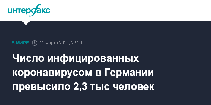 Москва. 12 марта. INTERFAX.RU - Число заразившихся коронавирусом в Германии выросло до 2369 человек, сообщает в четверг институт Роберта Коха.