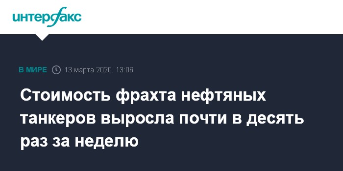 Москва. 13 марта. INTERFAX.RU - С конца прошлой неделе тарифы на фрахт нефтяных танкеров взлетели почти в 10 раз в связи с планами производителей нефти увеличить добычу, пишет The Wall Street Journal со ссылкой на брокеров.