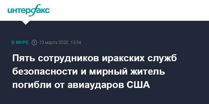 Москва. 13 марта. INTERFAX.RU - Авиаудары США, нанесенные в ночь на пятницу по объектам проиранского ополчения в Ираке, привели к гибели шести человек - пяти сотрудников иракских служб безопасности и мирного жителя, сообщает телеканал "Аль-Арабийя" со ссылкой на заявление иракских военных.