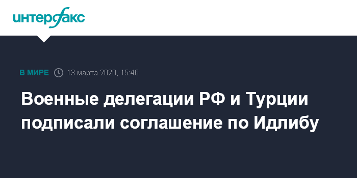 Москва. 13 марта. INTERFAX.RU - Делегации Турции и РФ на переговорах в Анкаре подписали соглашение об урегулировании ситуации в сирийской провинции Идлиб, заявил в пятницу глава Минобороны Турции Хулуси Акар.