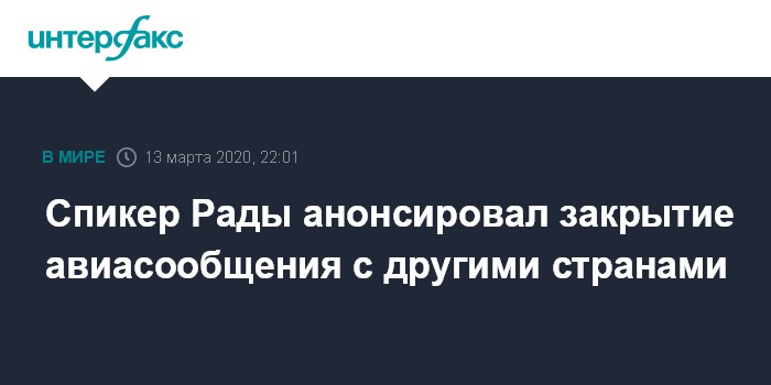 Москва. 13 марта. INTERFAX.RU - Пассажирское авиасообщение Украины с другими странами будет полностью закрыто в полночь 17 марта, сообщил председатель Верховной Рады Дмитрий Разумков.