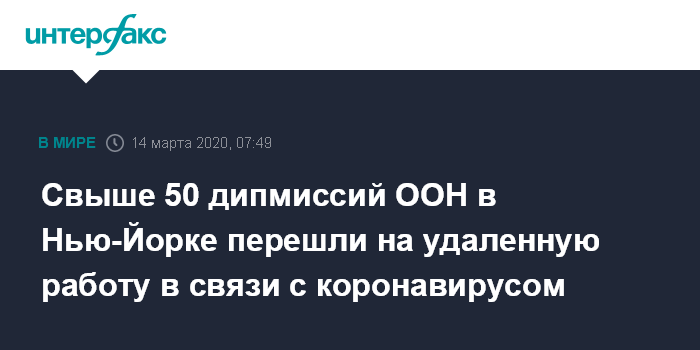 По словам одного из собеседников агентства, "в свете информации о первом случае заражения в дипкорпусе и последовавших решений генсекретаря ООН, касающихся отмены мероприятий и введения мер предосторожности из-за распространения коронавируса, представительства государств при Организации одно за одним стали отправлять своих сотрудников домой".