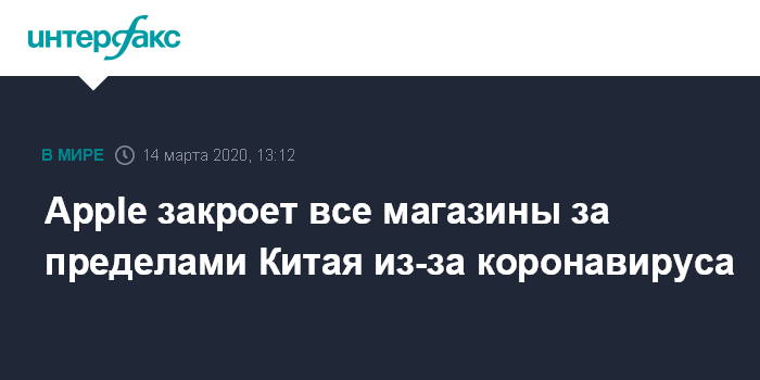 Москва. 14 марта. INTERFAX.RU - Apple приняла решение временно закрыть все свои магазины за пределами Китая из-за распространения коронавируса, говорится в заявлении гендиректора компании Тима Кука, опубликованном в субботу на ее сайте.