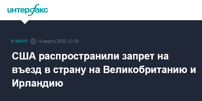 Москва. 15 марта. INTERFAX.RU - Президент США Дональд Трамп решил расширить список европейских стран, в отношении которых действуют ограничения на поездки из-за распространения коронавируса COVID-19, включив в него Великобританию и Ирландию, сообщил вице-президент Майк Пенс.