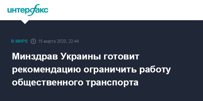 Москва. 15 марта. INTERFAX.RU - Министерство здравоохранения Украины рекомендует ограничить работу общественного транспорта, сообщил замминистра, главный государственный санитарный врач Украины Виктор Ляшко в ходе брифинга в Киеве в воскресенье.