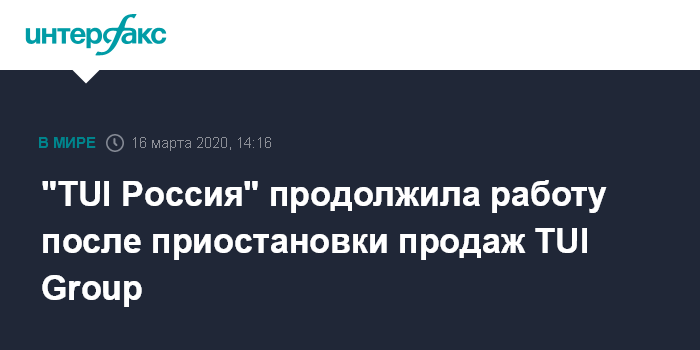 Москва. 16 марта. INTERFAX.RU - Европейский туристический холдинг TUI Group прекратил продажу туров, круизов и оказание услуг из-з коронавируса и в соответствии с правительственными рекомендациями. Компания "TUI Россия" продолжает работу в штатном режиме, сообщили в руководстве оператора.