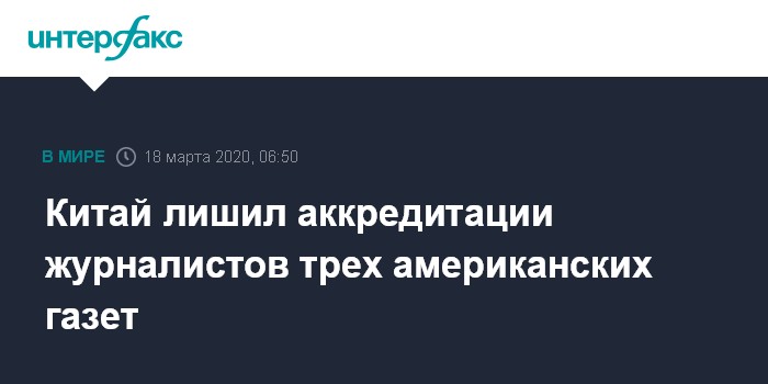 Москва. 18 марта. INTERFAX.RU - МИД КНР объявил, что журналисты американских изданий New York Times, Wall Street Journal и Washington Post лишаются аккредитации в Китае и потребовал сдать журналистские удостоверения в 10-дневный срок.