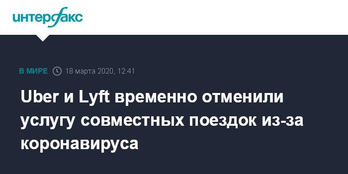 Москва. 18 марта. INTERFAX.RU - Сервисы заказа такси Uber Technologies Inc. и Lyft Inc. временно отказались от предоставления услуги совместных поездок из-за эпидемии, вызванной коронавирусом COVID-19.