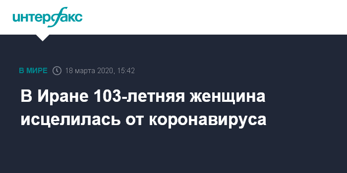 Москва. 18 марта. INTERFAX.RU - В Иране 103-летняя женщина полностью вылечилась от коронавируса, сообщают в среду иранские СМИ.