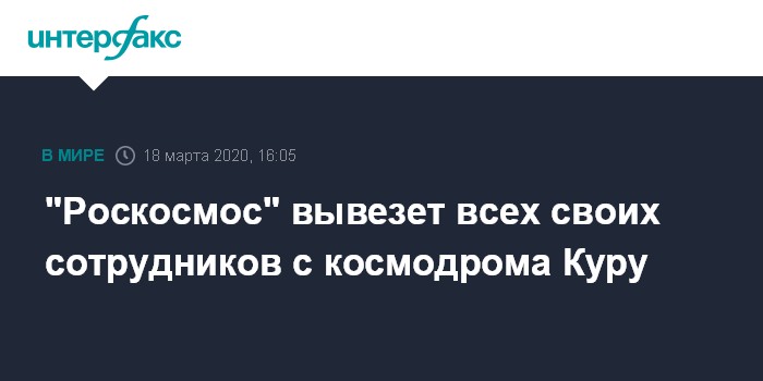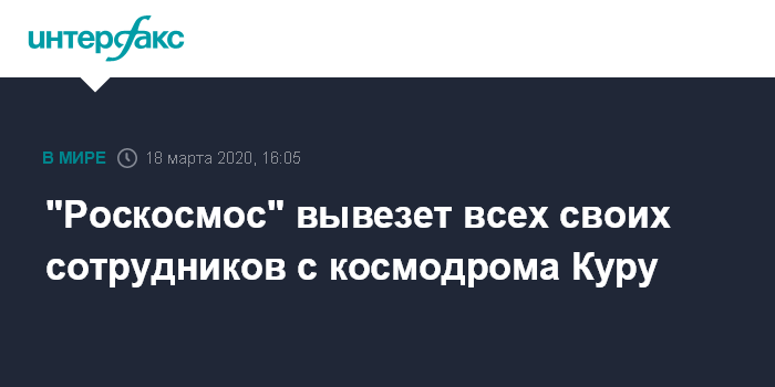 Москва. 18 марта. INTERFAX.RU - Сотрудники "Роскосмоса", занятые на подготовке к пуску российской ракеты "Союз-СТ", будут вывезены в РФ из Гвианского космического центра, прекратившего пуски из-за коронавируса. Об этом сообщили "Интерфаксу" в пресс-службе госкорпорации.
