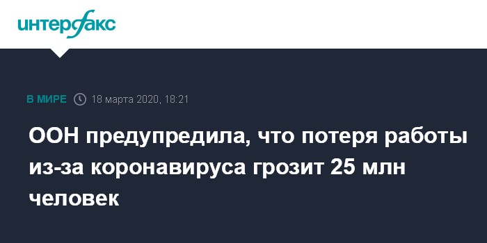 Москва. 18 марта. INTERFAX.RU - Пандемия коронавируса COVID-19 существенно увеличит безработицу в мире, лишив работы почти 25 млн человек, сообщается в среду на сайте Международной организации труда (МОТ, специализированное учреждение ООН, занимающееся вопросами трудовых отношений).