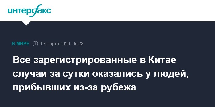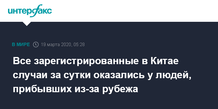 Москва. 19 марта. INTERFAX.RU - В материковом Китае за истекшие сутки зарегистрировано 34 новых случаев заражения коронавирусом, все - у людей, прибывших из-за рубежа, сообщил Госкомздрав КНР.