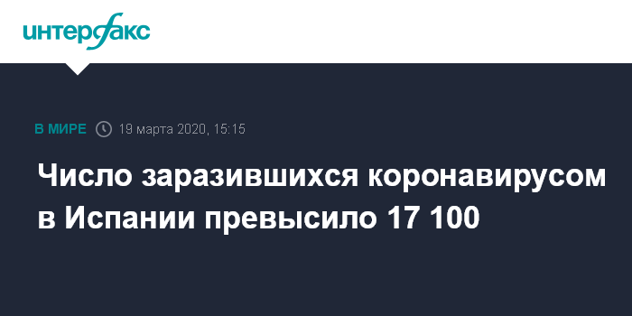 Москва. 19 марта. INTERFAX.RU - В Испании за сутки число заразившихся коронавирусом выросло на 3431 и составило 17 147, сообщила газета El Pais. Количество умерших выросло на 129, до 767.