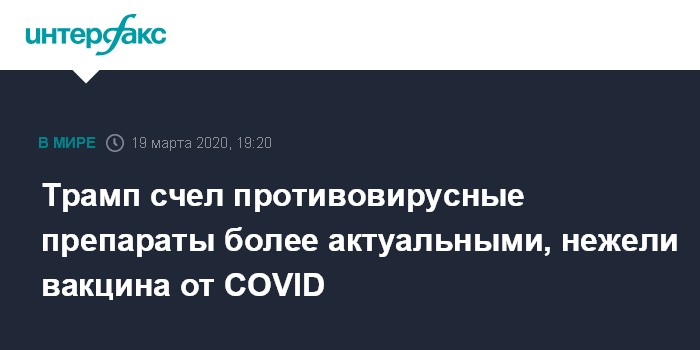 Москва. 19 марта. INTERFAX.RU - Поскольку на разработку вакцины против коронавируса уйдет немало времени, в нынешних условиях особую значимость приобретает терапия с использованием противовирусных препаратов, заявил президент США Дональд Трамп.
