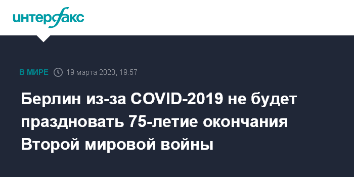 Москва. 19 марта. INTERFAX.RU - Берлин из-за пандемии COVID-2019 отменяет официальное празднование 75-летия окончания Второй мировой войны, говорится в сообщении пресс-службы МВД ФРГ, поступившем в "Интерфакс".
