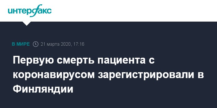 Москва. 21 марта. INTERFAX.RU - В Финляндии скончался пациент, заболевший коронавирусом, сообщает в субботу телерадиокомпания Yle со ссылкой на Национальный институт здравоохранения и соцобеспечения страны.