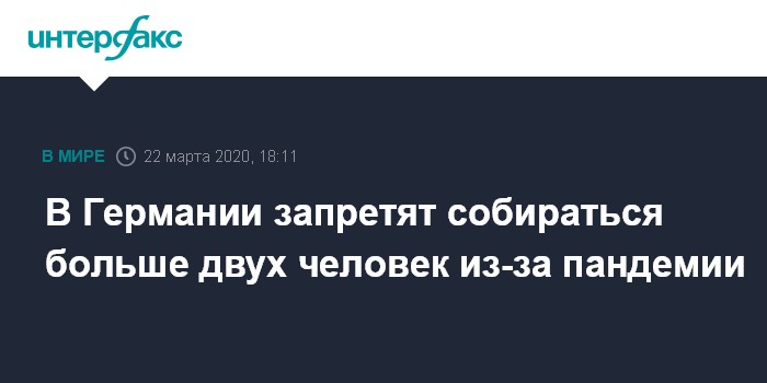 Москва. 22 марта. INTERFAX.RU - Правительство ФРГ и руководство 16 федеральных земель Германии приняло решение запретить людям собираться больше двух из-за пандемии коронавируса, сообщает в воскресенье агентство Dpa.