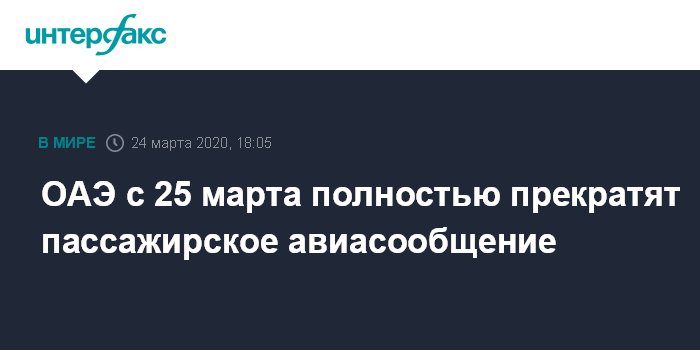 Москва. 24 марта. INTERFAX.RU - Власти Объединенных Арабских Эмиратов (ОАЭ) полностью запретили пассажирское авиасообщение из всех аэропортов страны, запрет вступает в силу в полночь 25 марта и продлится две недели, сообщает газета The National.