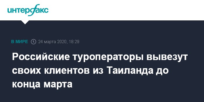 Москва. 24 марта. INTERFAX.RU - Туроператоры вывезут всех своих клиентов из Таиланда до 31 марта, самостоятельным туристам для возвращения домой следует обращаться в посольство РФ в королевстве, сообщили "Интерфаксу" в туркомпаниях.