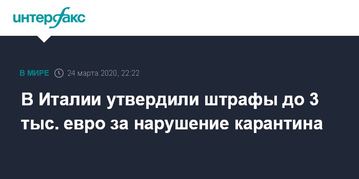Москва. 24 марта. INTERFAX.RU - Совет министров Италии утвердил штрафы до 3 тыс. евро для граждан, которые нарушают меры по борьбе против коронавируса, сообщает во вторник итальянские СМИ.