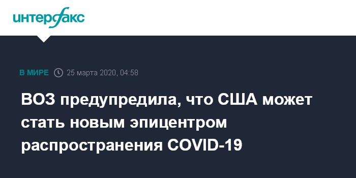 Москва. 25 марта. INTERFAX.RU - Всемирная организация здравоохранения (ВОЗ) предупредила, что новым эпицентром распространения коронавируса COVID-19 могут стать США.