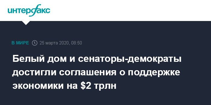 Москва. 25 марта. INTERFAX.RU - Администрация президента США Дональда Трампа и сенаторы-демократы достигли соглашения по законопроекту об экстренной помощи американской экономике и гражданам общим объемом порядка $2 трлн, сообщает Dow Jones со ссылкой на директора по законодательным вопросам Белого дома Эрика Уэланда.