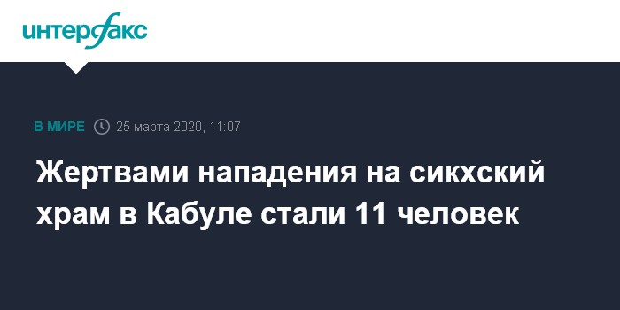 Москва. 25 марта. INTERFAX.RU - В Кабуле, в районе Шорбазар террористы напали на сикхский храм, погибли не менее 11 человек, бой с тремя напавшими продолжается, сообщило афганское агентство Tolonews.