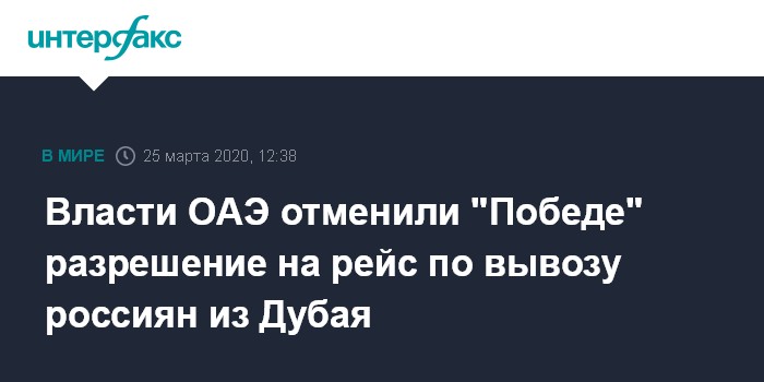 "Сегодня "Победа" во время рейса Москва - Дубай, организованного для вывоза своих клиентов из ОАЭ, получила аннуляцию подтвержденного ранее авиационными властями ОАЭ плана полета с запретом на выполнении посадки в Дубае", - сообщила представитель перевозчика журналистам.