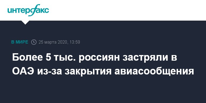 Москва. 25 марта. INTERFAX.RU - В ОАЭ находятся более пяти тысяч россиян, которые не могут улететь домой из-за закрытия страной авиасообщения, туроператоры не в силах им помочь, сообщила исполнительный директор Ассоциации туроператоров России (АТОР) Майя Ломидзе.