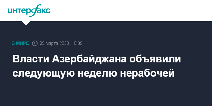 Москва. 25 марта. INTERFAX.RU - Кабинет министров Азербайджана в целях предотвращения распространения коронавируса (COVID-19) объявило о введении особого трудового режима на территории страны на следующей неделе, сообщает оперативный штаб по борьбе с новой инфекцией.