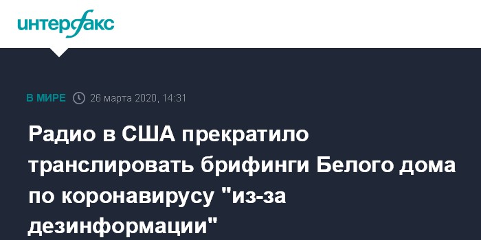 Москва. 26 марта. INTERFAX.RU - В США национальная радиостанция KUOW, которая базируется в штате Вашингтон, объявила, что больше не будет давать в прямом эфире брифинги Белого дома по ситуации с коронавирусом из-за "дезинформации".