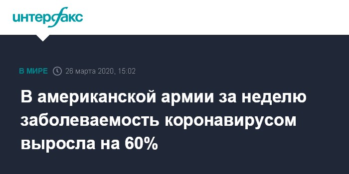 Москва. 26 марта. INTERFAX.RU - Число заболевших коронавирусом среди американских военных на текущей неделе выросло на 60%, следует из данных министерства обороны США.