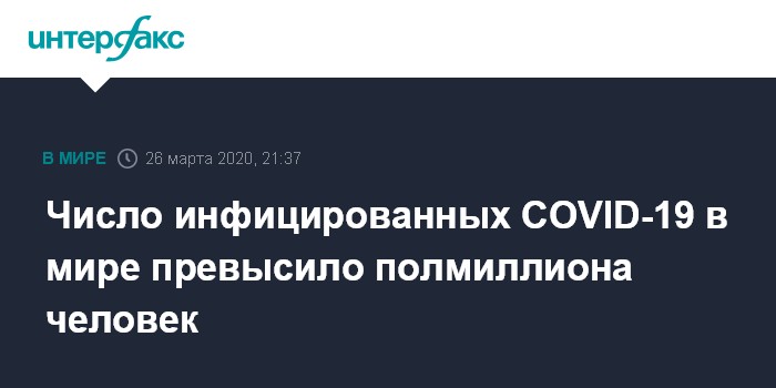 Москва. 26 марта. INTERFAX.RU - В мире с начала вспышки нового типа коронавируса COVID-19 зарегистрировано более 500 тысяч случаев заражения. Об этом сообщает в четверг университет Джонса Хопкинса.