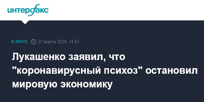 Москва. 27 марта. INTERFAX.RU - Президент Белоруссии Александр Лукашенко назвал недальновидным решение США ввести чрезвычайное положение в связи с пандемией коронавируса, но похвалил позицию Дональда Трампа; ситуацию вокруг COVID-19 он назвал "психозом", который, по его словам, остановил мировую экономику.