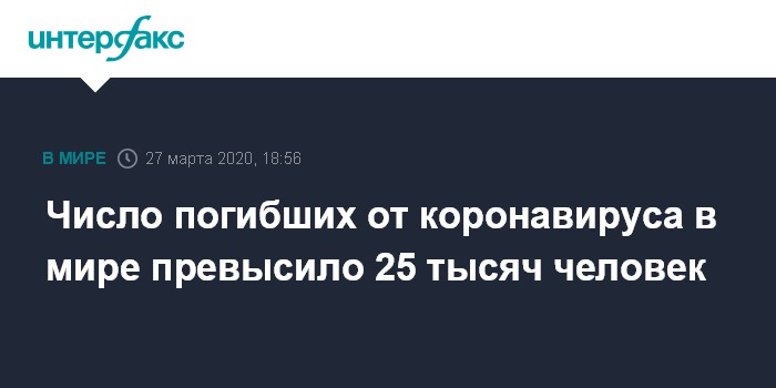 Москва. 27 марта. INTERFAX.RU - Более 25 тысяч человек скончались впоследствии заражения новым типом коронавируса COVID-19 с начала эпидемии, свидетельствуют данные университета Джонса Хопкинса.