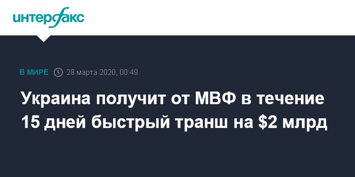 Москва. 28 марта. INTERFAX.RU - Президент Украины Владимир Зеленский сообщил, что после выполнения условий МВФ по принятию закона о рынке земли и о невозврате неплатёжеспособных банков экс-владельцам Украина в течение 15 дней получит первый быстрый транш на $2 млрд сразу в бюджет страны.
