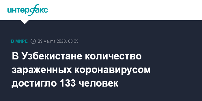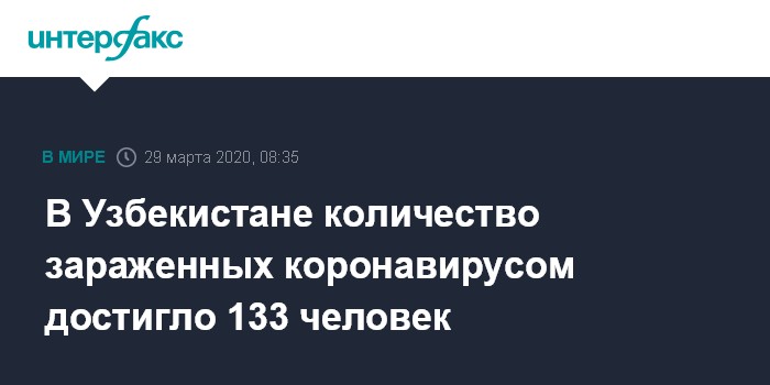 Москва. 29 марта. INTERFAX.RU - Число заражений COVID-19 в Узбекистане на утро 29 марта увеличилось до 133 человек, выявлено еще 29 больных, сообщает Минздрав республики.
