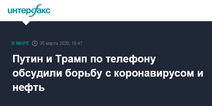 Москва. 30 марта. INTERFAX.RU - Президенты РФ и США Владимир Путин и Дональд Трамп обсудили в телефонном разговоре вопросы борьбы с коронавирусом и ситуацию на рынке нефти.