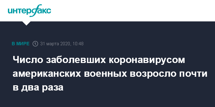 Всего на данный момент в ВС США положительный результат на вирус выявлен у 1087 человек. Непосредственно среди американских военнослужащих количество инфицированных возросло с 309 до 569.