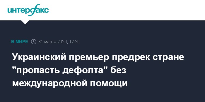 Москва. 31 марта. INTERFAX.RU - Премьер-министр Украины Денис Шмыгаль считает, что без поддержки международных финансовых организаций в плане погашения внутренних и внешних долгов стране придется упасть в "пропасть финансового дефолта".