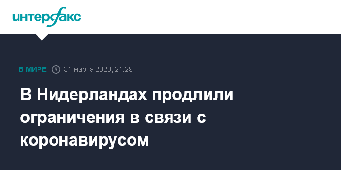 Москва. 31 марта. INTERFAX.RU - Ограничительные меры в рамках борьбы с распространением коронавируса в Нидерландах продлеваются с 6 апреля до 28 апреля, сообщил во вторник вечером премьер-министр Марк Рютте после заседания кризисного штаба.