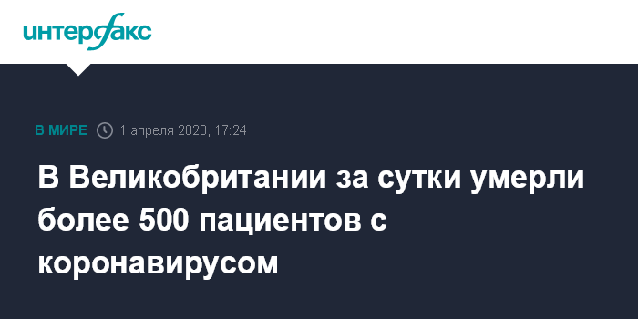 Москва. 1 апреля. INTERFAX.RU - В Великобритании за сутки зафиксировали еще 563 случая смерти пациентов из-за осложнений, вызванных заражением коронавирусом COVID-19, сообщил в среду телеканал Sky News со ссылкой на Минздрав страны.