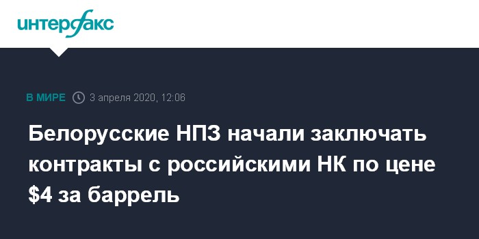Москва. 3 апреля. INTERFAX.RU - Белорусские нефтеперерабатывающие заводы начали заключать контракты с российскими нефтяными компаниями по цене $4 за баррель, сообщила пресс-служба концерна "Белнефтехим". Пока речь идет о контрактах на апрель.